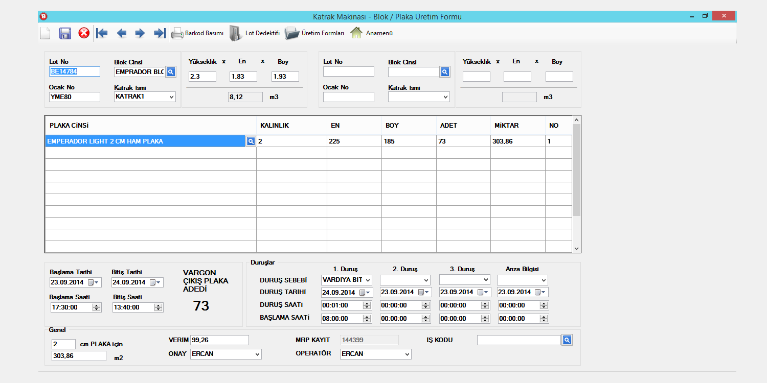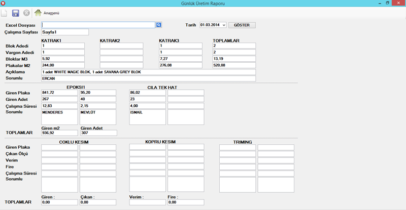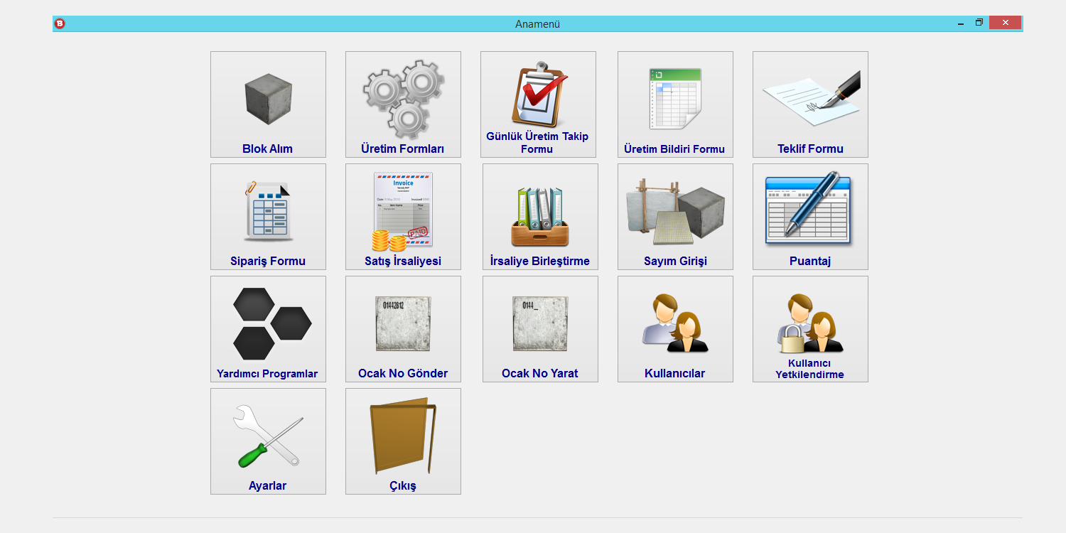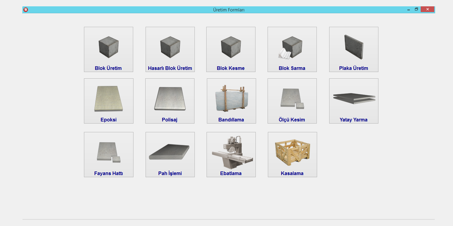 Mermer ocak ve fabrikalarının üretim, teklif, sipariş, satış, alış, personel puantajlarını kapsayan programdır. Ocakta üretilen taşlar için tekrarsız sayı oluşturma ve bu sayıları ocağa göndermek için excel oluşturmaya yarar. Bu işlem her taşa benzersiz kod numarası vermek için yapılır. Oluşturulan excel dosyasındaki ocak numaralarına göre blok üretimi gerçekleşir. Blok üretim formunda ocak bazlı üretim görülebilmekte, üretimlerin kalite ve kademe bilgileri tutulmaktadır.