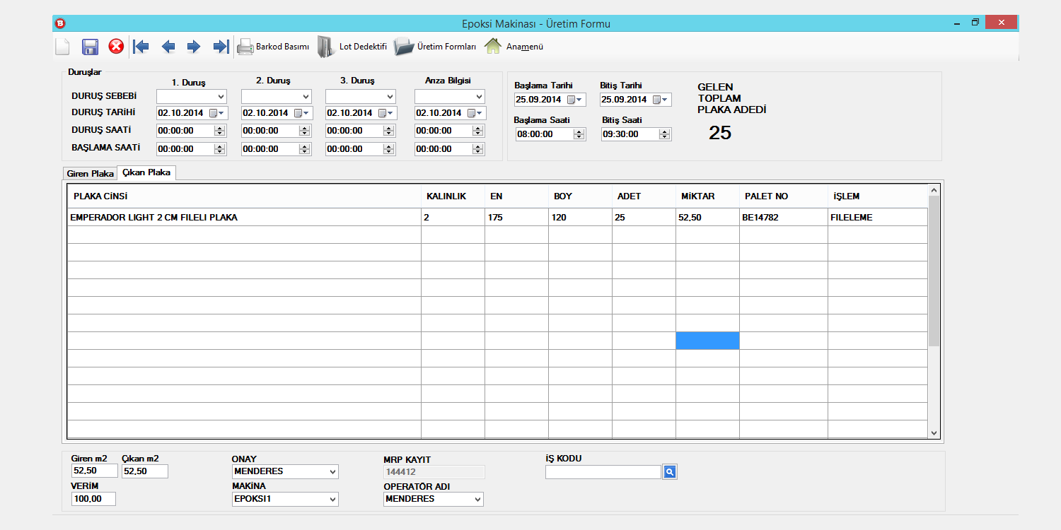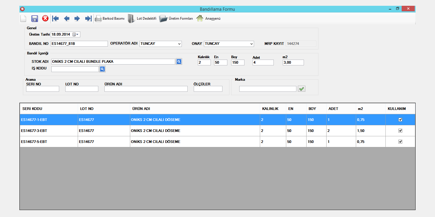 Ocaklarda internet erişim sorunu yaşayan yerler için ocaklardan gönderilecek excel şablonu ile üretim yapılabilmektedir. Fabrikadaki işleyiş blokların alış irsaliyesi ile sisteme girilip bloğun işlenmesi üzerinedir. Ham plaka, epoksi, polisaj, ölçü kesim, yatay yarma, fayans hattı, pah işlemi, ebatlama, bandıl ve kasalama üretimleri için ayrı modüller bulunur. Üretim yapılan hatta göre barkodlu ürün bilgisi yadırılabilir. Üretilen ürünlerin teklif veya siparişlerini seri bilgisi ile beraber kayıt eder. Satış irsaliyesinde ise ocak, marka veya lot numarası yardımıyla siparişler irsaliyeye döüştürülür. Puantaj formunda ise personel kartı tanımlanan kişilerin günlük olarak çalışma durumlarını saklayan ve bunun sonucunda personel maaşını hesaplayıp Netsis'e aktarımını sağlayan formdur.